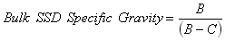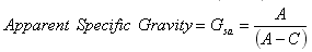 Note that the quantity (B – C) is the mass of water displaced by the SSD aggregate sample. In the apparent specific gravity calculation the mass of the SSD aggregate sample is replaced by the mass of the oven-dry aggregate sample (A replaces B), which means that the water permeable voids within the aggregate are not included and (A – C) is the mass of water displaced by the oven-dry sample.