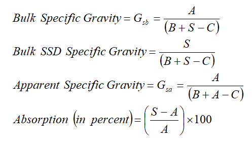 These masses are used to calculate the various specific gravities and absorption using the following equations: