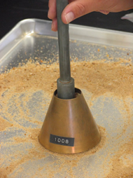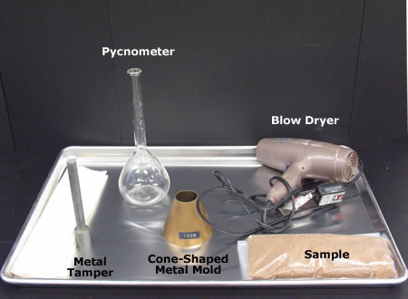 The fine aggregate specific gravity test (Figure 1) is used to calculate the specific gravity of a fine aggregate sample by determining the ratio of the weight of a given volume of aggregate to the weight of an equal volume of water. It is similar in nature to the coarse aggregate specific gravity test.