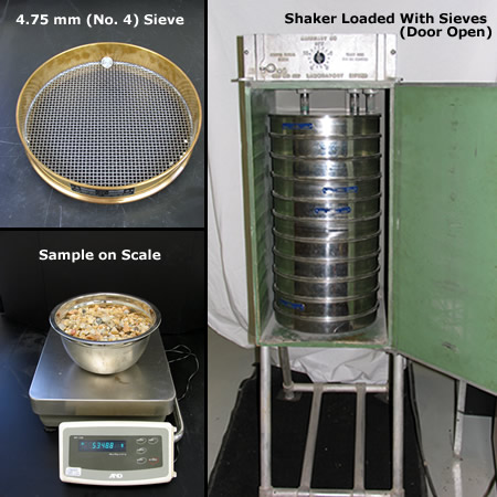 The basic sieve analysis consists of weighing an aggregate sample and then passing it through a nest of sieves. The nest of sieves is made up of a stack of wire-cloth screens with progressively smaller openings from top to bottom. The material retained on each sieve (Slideshow 1) is weighed and compared to the total sample mass. Particle size distribution is expressed as a percent retained or percent passing by weight on each sieve size. Figure 16 shows the major gradation and size analysis equipment.