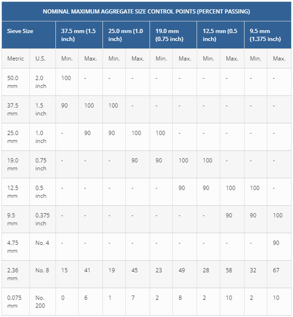 The following table (from AASHTO M 323) shows the gradation control points used by the Superpave mix design process. Sometimes, local agencies modify these control points to suit local need.