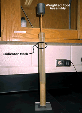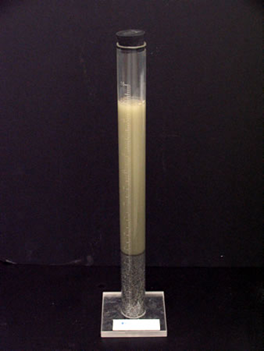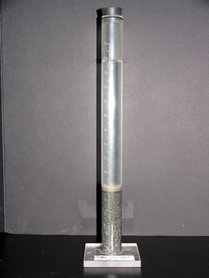 The sand equivalent test (Figure 58) is a rapid field test to show the relative proportions of fine dust or clay-like materials in fine aggregate (or granular soils). The term “sand equivalent” expresses the concept that most fine aggregates are mixtures of desirable coarse particles (e.g., sand) and generally undesirable clay or plastic fines and dust (ASTM, 2003[1]).These materials can coat aggregate particles and prevent proper asphalt binder-aggregate bonding.