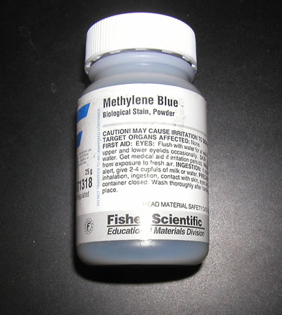 This test adds quantities of a standard aqueous solution of methylene blue (MB) dye (Figure 59) to a sample of dry fine aggregate passing the No. 200 (0.075 mm) sieve until adsorption of the dye ceases. The MB solution is titrated step wise in 0.5 ml increments from the burrette into a continually stirred fine aggregate suspension. After each addition of MB solution and stirring for one minute, a small drop of the aggregate suspension is removed with a glass rod and placed on a filter paper. Initially, a well-defined circle of MB-stained dust is formed and is surrounded with an outer ring of clear water. Successive additions of MB solution are repeated until the end point is reached when the ring of clear water turns light blue.