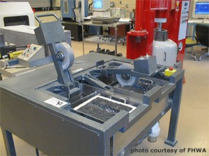 read more ...Overview Laboratory wheel-tracking devices (Figure 138) are used to run simulative tests that measure HMA qualities by rolling a small loaded wheel device repeatedly across a prepared HMA specimen. Performance of the test specimen is then correlated to actual in-service pavement performance. Laboratory wheel-tracking devices can be used to make rutting, fatigue, moisture susceptibility and stripping predictions. Some of these devices are relatively new and some have been used for upwards of 15 years like the French Rutting Tester (FRT).