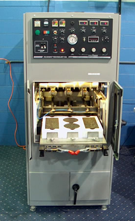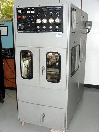 Three sets of HMA samples are loaded into the temperature controlled chamber of the APA. Gauge readings are taken initially and then again after 8,000 load cycles. The difference between the two readings is the rutting induced by the APA. An average of all samples in the APA (6 cylindrical or 3 beam) is reported as the average APA rut depth. Figure 1 shows the APA with samples pulled out.
