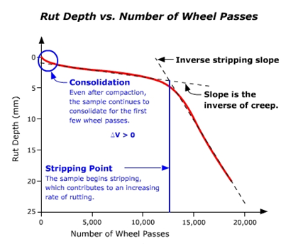 The more popular laboratory wheel tracking devices in the U.S. are generally recognized, in order of decreasing popularity, as the Asphalt Pavement Analyzer (APA), Hamburg Wheel Tracking Device (HWTD) and French Rutting Tester (FRT). These devices are all capable of proof testing HMA mixtures (i.e., providing a pass-fail test based on rutting potential, Figure 139) and can be reasonably well correlated to field rut performance. However, none should be relied on to predict field rut depths for specific projects based on laboratory wheel tracking rut depth relationships developed on other projects with different geographical locations and traffic. Additionally, due to the complex stress state of the samples, these tests cannot be used for mechanistic pavement design input.