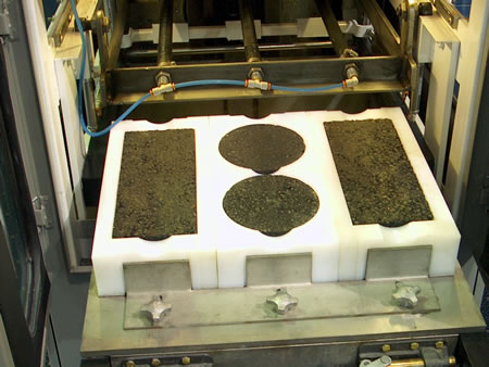 The FRT tracks a loaded pneumatic tire back and forth across a HMA sample. Tests are typically conducted on 7.1 x 19.7 x 0.8-3.9 inch (180 x 50 x 20-100 mm) slabs compacted with a plate compactor (Figure 144). Most commonly, the tire is tracked across a sample for 30,000 cycles using a 1124 lb (500 N) load applied to a pneumatic tire inflated to 87 psi (600 kPa) (Cooley et al., 2000[1]). Aschenbrener (1992[8]) showed that the FRT can be used to differentiate between good and poor field rut performance in the U.S. The FHWA has a good concise description of the FRT at: www.tfhrc.gov/pavement/asphalt/labs/mixtures/frenchr.htm.