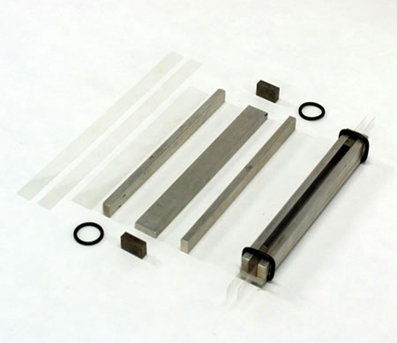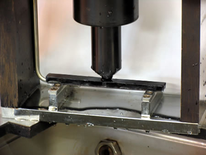 A sample of asphalt binder is molded into a beam measuring 0.246 x 0.492 x 5.000 inches (6.25 x 12.5 x 127 mm) (Figure 171). This sample is then simply supported at two points 4.02 inches (102 mm) apart in a controlled temperature fluid bath. The beam is then loaded at the midpoint by a 0.22 lb (100 g) load that, under normal gravity conditions, produces 0.22 lb (0.98 N) of force. The beam deflection is measured at 8, 15, 30, 60, 120 and 240 seconds. Beam stiffness, often called “creep stiffness”, is calculated for these times. A stiffness master curve is then fitted to these points. The BBR test is done on two beam samples.Figure 172 shows the major BBR equipment.