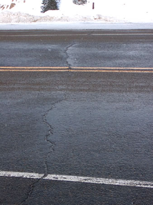 As surrounding temperatures drop, pavements contract and build up internal stresses. If this contraction occurs fast enough the pavement may crack because it does not have time to relax these stresses. This type of crack, typically called a “thermal crack”, or transverse crack (because of the direction of cracking in relation to the direction of traffic) (Figure 170) can result from either of two related mechanisms: