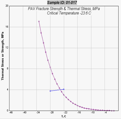 The BBR is a test designed to measure this stiffness and the rate of stress relaxation. Asphalt binders that are not too stiff at low temperatures and able to relax built up stresses are desirable. Results from the BBR are combined with results from the DTT to determine an asphalt binder’s critical cracking temperature and PG low temperature grade.