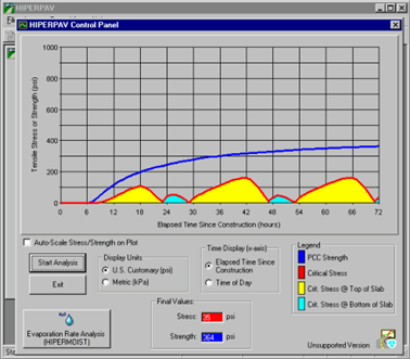 The FHWA and the Transtec Group, Inc. have produced a software package, termed HIgh PERformance PAVing (HIPERPAV), that is capable of assessing the influence of mix design, structural design, construction methods and environmental conditions on the early-age behavior of rigid pavements. HIPERPAV was originally produced for an FHWA study of fast-track rigid pavements. The goal of this project was to develop high early strength rigid pavements that could be rapidly opened to traffic upon construction completion. What this project discovered was that rapid-setting high early strength PCC created a new set of concerns including: uncontrolled slab cracking, spalling and excessive plastic shrinkage. HIPERPAV addresses these issues and others by modeling early-age PCC pavement performance (Figure 89).
