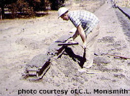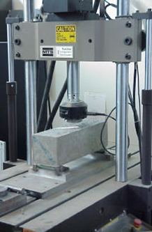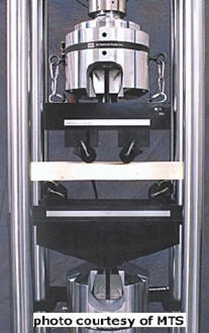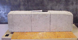 There are two basic flexural tests: the third-point loading (Figure 92) and the center-point loading (Figure 93). For maximum aggregate sizes less than 50 mm (2 inches), each test is conducted on a 152 x 152 x 508 mm (6 x 6 x 20 inch) PCC beam (see Figure 94 Figure 95). The beam is supported on each end and loaded at its third points (for the third-point loading test) or at the middle (for the center-point loading test) until failure. The modulus of rupture is then calculated and reported as the flexural strength. The third-point loading test is preferred because, ideally, in the middle third of the span the sample is subjected to pure moment with zero shear (Mindess and Young, 1981[1]). In the center-point test, the area of eventual failure contains not only moment induced stresses but also shear stress and unknown areas of stress concentration. In general, the center-point loading test gives results about 15 percent higher (ACPA, 2001).